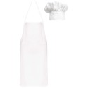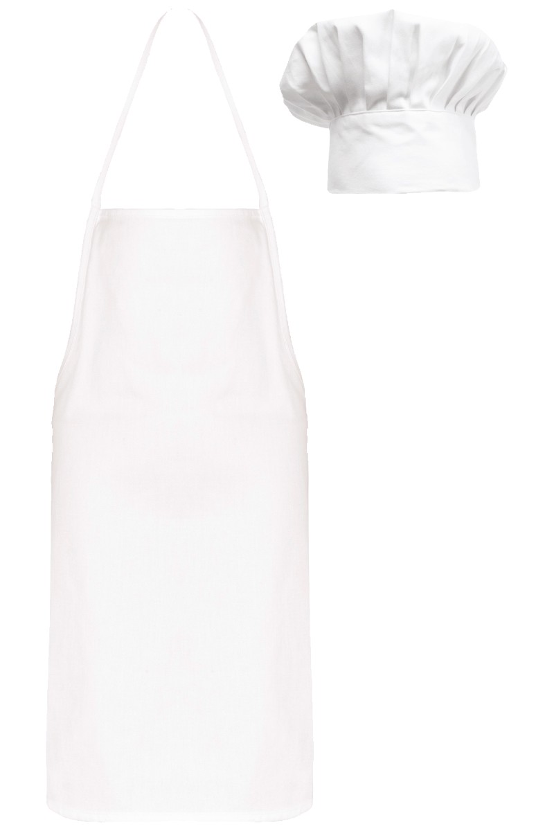 100% coton. Kit composé d'une toque et d'un tablier. Toque de chef réglable à l'aide d'une bande auto-agrippante.