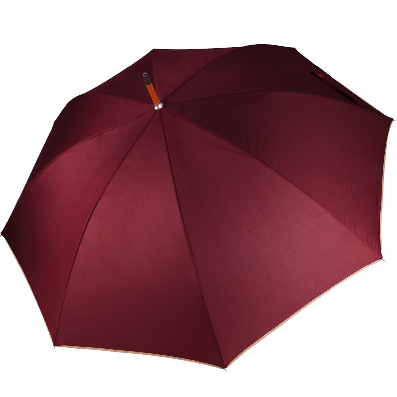 Parapluie modèle classique 23" (diamètre : 96 cm), ouverture automatique, mât en bois, baleines en métal, poignée arrondie en bois, toile 100% pongé de polyester, embouts de baleine en métal.