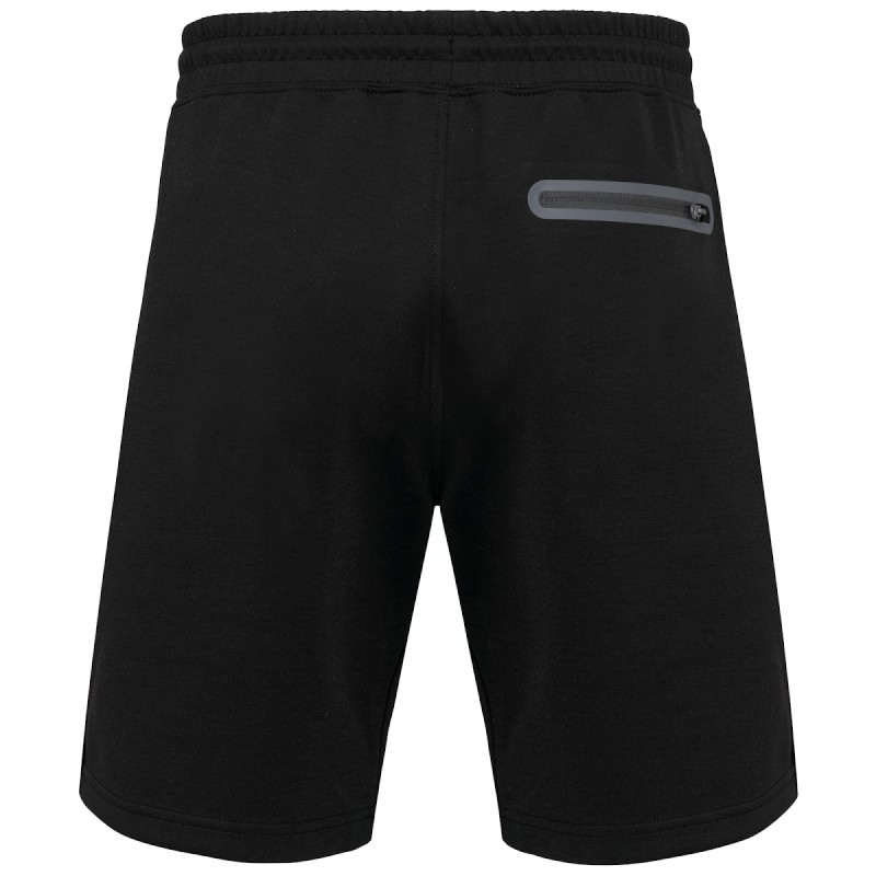 Coloris unis: 94% polyester/ 6% élasthanne. Coloris chinés :  79% polyester/ 15% viscose/ 6% élasthanne. Matière ultra confortable. Ceinture élastiquée avec cordon de serrage bicolore finition embout plastique et œillets métalliques. 2 poches devant doublées jersey et 1 poche arrière zippée, finition thermosoudée contrastée. Finition poches avec une partie élastiquée contrastée Black sur tous les coloris et Dark Grey sur le Black et le Ash Heather. Finition double aiguille sur bas de vêtement. Etiquette de marque Tear-away.