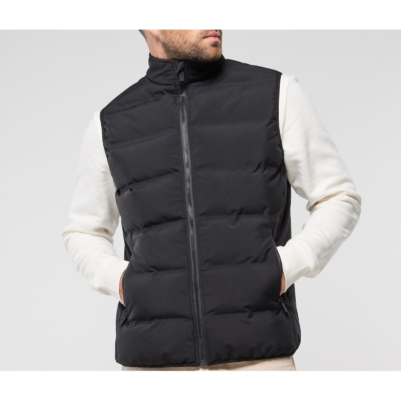 Ouatine recyclée. Bandes thermocollés. Protège cou. Biais élastiqués à la taille et aux emmanchures.