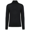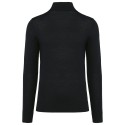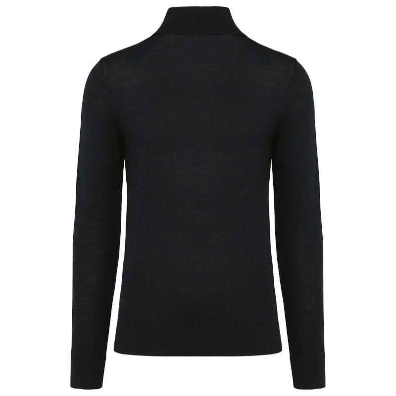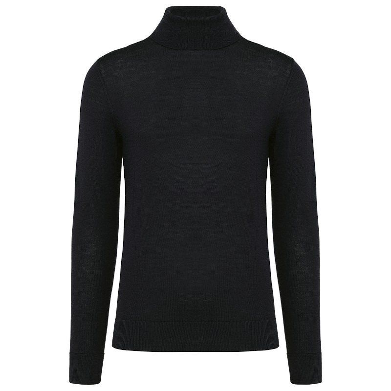 100% Mérinos. Laine extra-fine peignée. Jauge 14. Fully-fashioned : tricoté dans la forme et assemblé sur machine de remaillage. Col roulé, poignets et bas du vêtement rib 1 x 1.