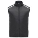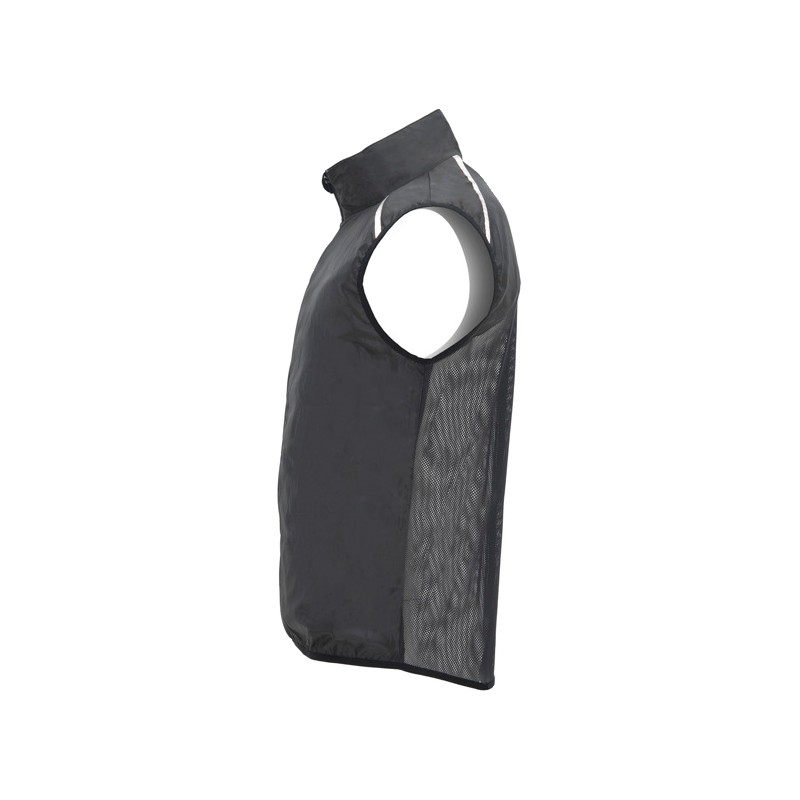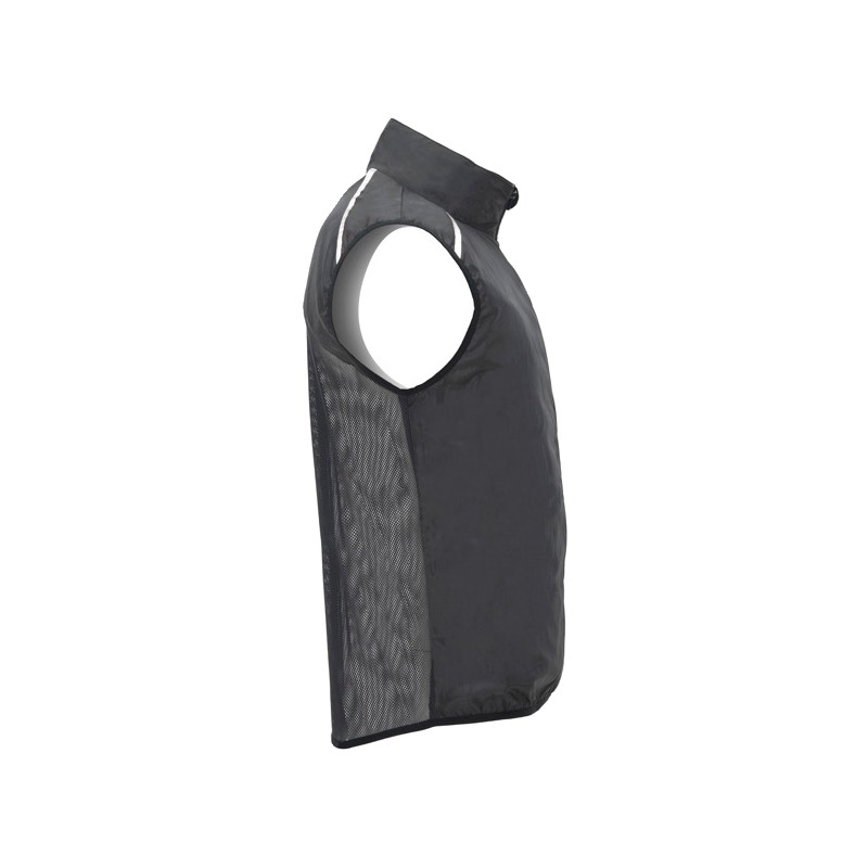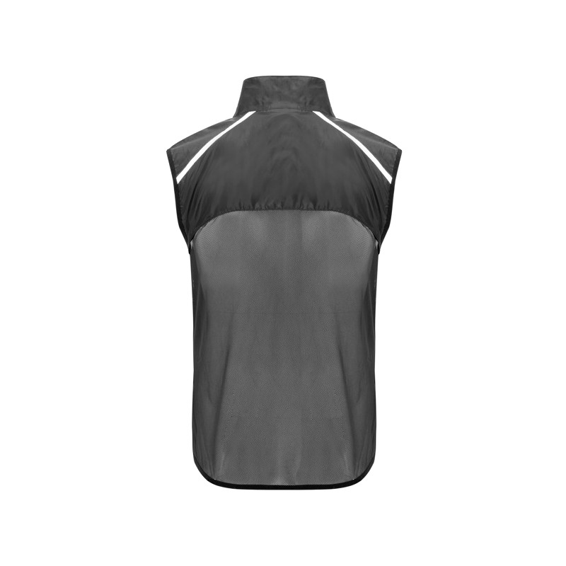 Gilet technique  léger pour running.1.- Fermeture éclair ton sur ton, avec protection menton.2.- Bas et emmanchure avec liseré élastique. 3.-Bas du dos en tissu microperforé.4.- Détails réfléssichants en haut, face avant et arrière,5.- Poche avec élastique pour garder le gilet et le porter au poignet.