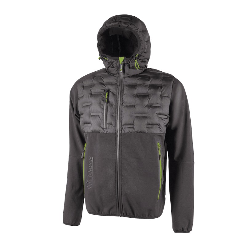 Buste et manches : 96% polyester / 4% spandex. Poitrine, épaules et capuche : 100% nylon 20D. Veste hybride respirante, coupe-vent et déperlante, extrêmement polyvalente. Elle est idéale pour les travaux dynamiques dans des environnements froids ou semi-tempérés tout en laissant une entière liberté de mouvement. Fermeture centrale avec fermeture éclair étanche. Capuche fixe et réglable, poignets élastiques. Veste matelassée avec technologie sans coutures. Doublure intérieure en nylon et micropolaire avec sérigraphie. Deux grandes poches frontales avec fermeture éclair fluorescente et une poche poitrine avec fermeture éclair étanche. Deux grandes poches intérieures. Ourlet profilé et passepoil fluorescent dans le dos. Logo U-Power ton sur ton.