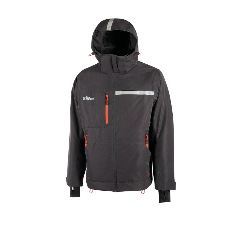 100% polyester. Veste de travail matelassée en graphène, permet une distribution homogène de la chaleur. Veste à capuche fixe ajustable grâce à une coulisse élastique et une fermeture centrale zippée. Imperméable, col intérieur en microfleece souple et partie inférieure ajustable avec une coulisse intérieure. Les poignets sont dotés d'un velcro et d’un système coupe-vent intérieur avec passe-pouce. La partie avant est dotée de deux poches avec des trous de drainage, plus deux poches verticales et une autre poche verticale sur la poitrine, toutes zippées. En plus des poches avant, deux très grandes poches intérieures, dont une zippée, sont également présentes. La veste est équipée d'une bande réfléchissante sur la poitrine côté gauche et sur la capuche dans les variantes de couleur Asphalt Grey et Dark Green, alors que dans la version Black Carbon les bandes ont un effet carbone. Logo réfléchissant « U-Power » sur le côté droit de la poitrine et impression « U-Supremacy » sur le dos. Trappe de visite à l'arrière pour permettre la personnalisation de la veste de travail et faciliter les impressions et broderies.