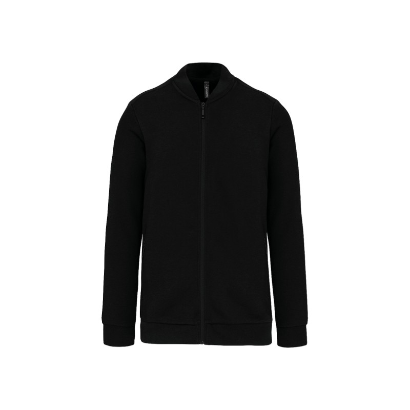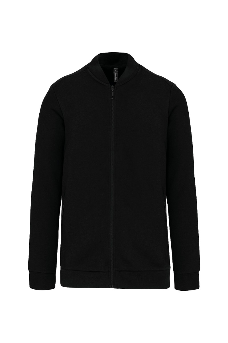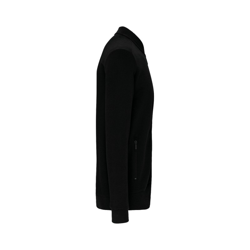 80% coton / 20% polyester. Molleton 3 fils avec traitement LSF (Low Shrinkage Fleece). Lavable à 60°C. Fermeture zippée et 2 poches zippées devant ton sur ton. Col Teddy. Bande de propreté chevron dans le col. Bord-côte bas de manches et bas de vêtement.
