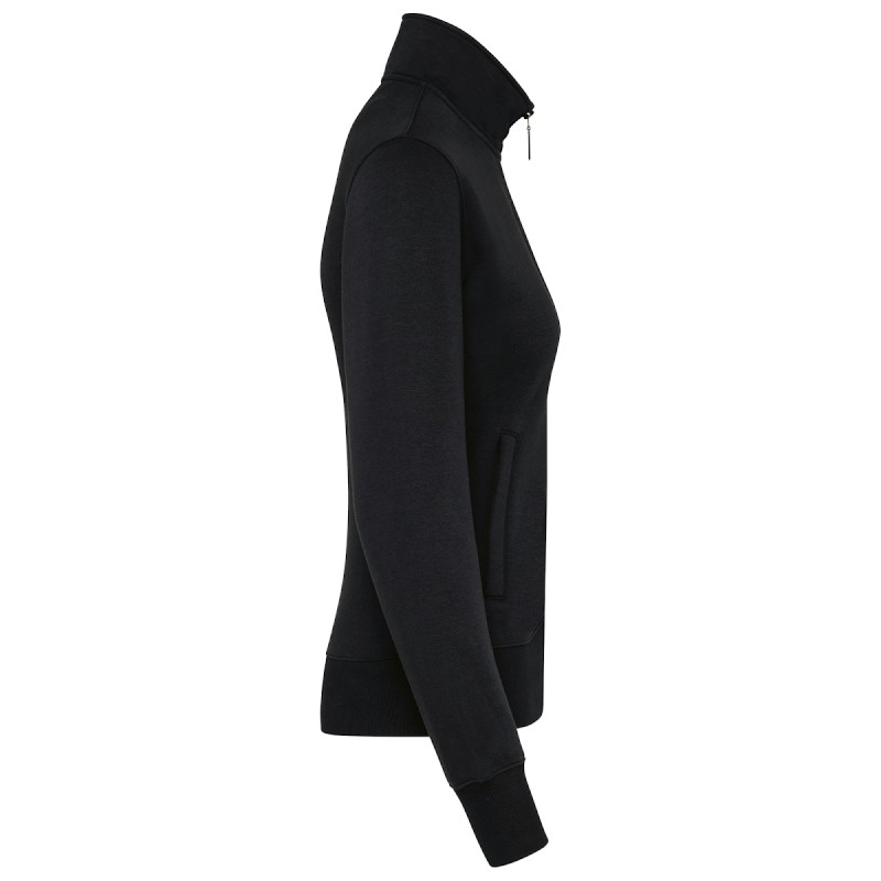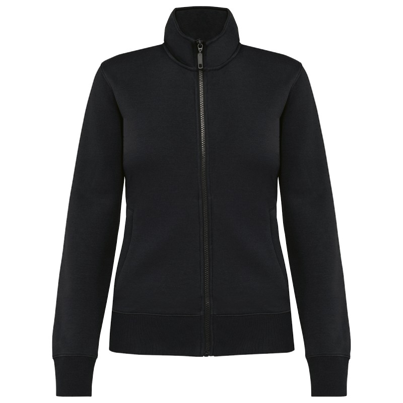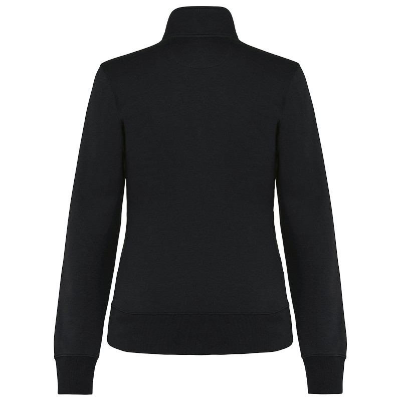 80% coton / 20% polyester. Surface extérieure 100% coton. Traitement LSF (Low Shrinkage Fleece : molleton prérétréci). Molleton gratté 3 fils en coton peigné. Coupe ajustée. Manches droites. Col montant. Fermeture zippée plastique ton sur ton. 2 poches zippées et passepoilées côté.  Finition demi-lune à l'encolure dos pour faciliter la personnalisation de marque à l'intérieur col. Finition bord-côte 1x1 bas de manches et de vêtement. Etiquette de marque Tear Away.