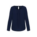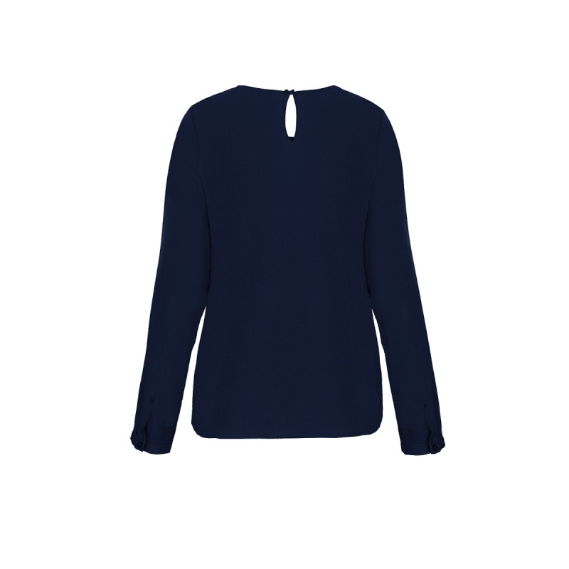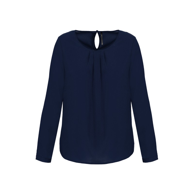100% polyester. Matière crêpe fluide et légère. Encolure ronde avec biais. Petites fronces à l'encolure devant. Fermeture à l'arrière et au bas de manches par un bouton recouvert.
