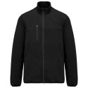 100% polyester recyclé. Maille polytricot grattée. Lavage 40°C. Empiècements en softshell contrastée 2 couches 100% polyester avec traitement déperlant sur haut du corps devant et dos, côtés et dessous de manches. Fermeture zippée avec protège menton. 2 poches côtés zippées. 1 poche plaquée poitrine contrastée zippée côté droit au porté. 2 poches intérieures. Finitions biais contrastés au bas de manches et bas de vêtement. Etiquette de marque détachable.