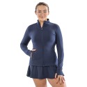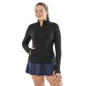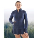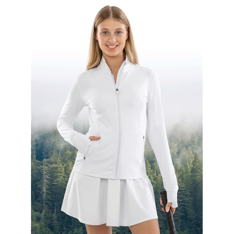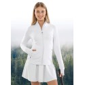 78% polyester recyclé, 22% élasthanne. Veste de sport ajustée et très extensible pour femmes, fabriquée à partir de tissus recyclés. Idéale pour le tennis et tous les sports. La manchette empêche le retroussement de la manche et protège la paume de la main. Fermeture zippée au col sur le devant et poches latérales zippées.
