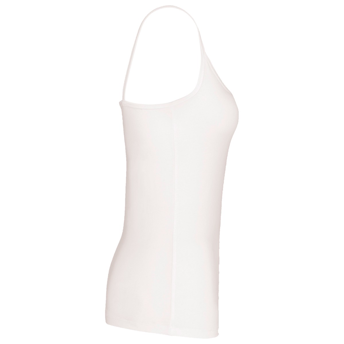 95% coton / 5% élasthanne. (Light Grey Heather : 87% coton / 9% viscose/ 4% élasthanne). Maille jersey en coton peigné. Fines bretelles et coupe féminine. Finition petit biais encolure et double aiguille au bas du vêtement.