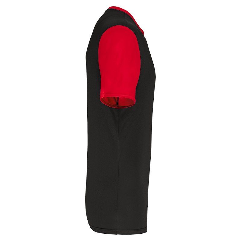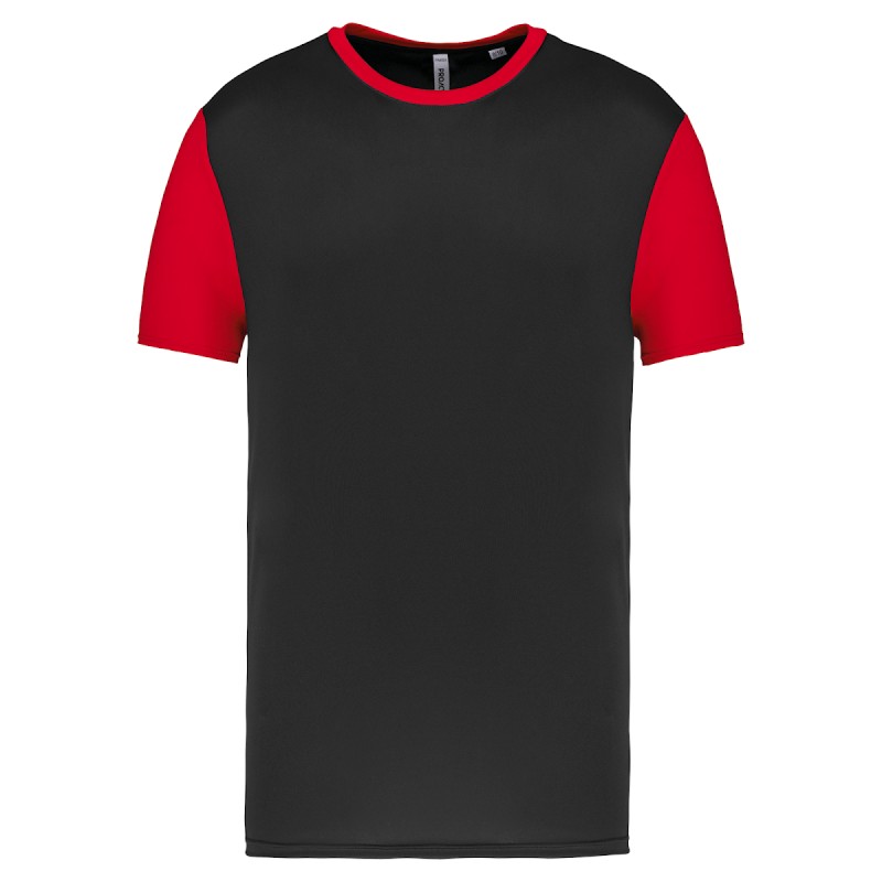 100% polyester. Maille interlock. Coupe droite. Encolure ronde contrastée et bande de propreté. Manches droites contrastées. Finitions double aiguille au bas de manches et de vêtement. Certifié STANDARD 100 by OEKO-TEX® N° CQ 1007/7, IFTH.