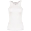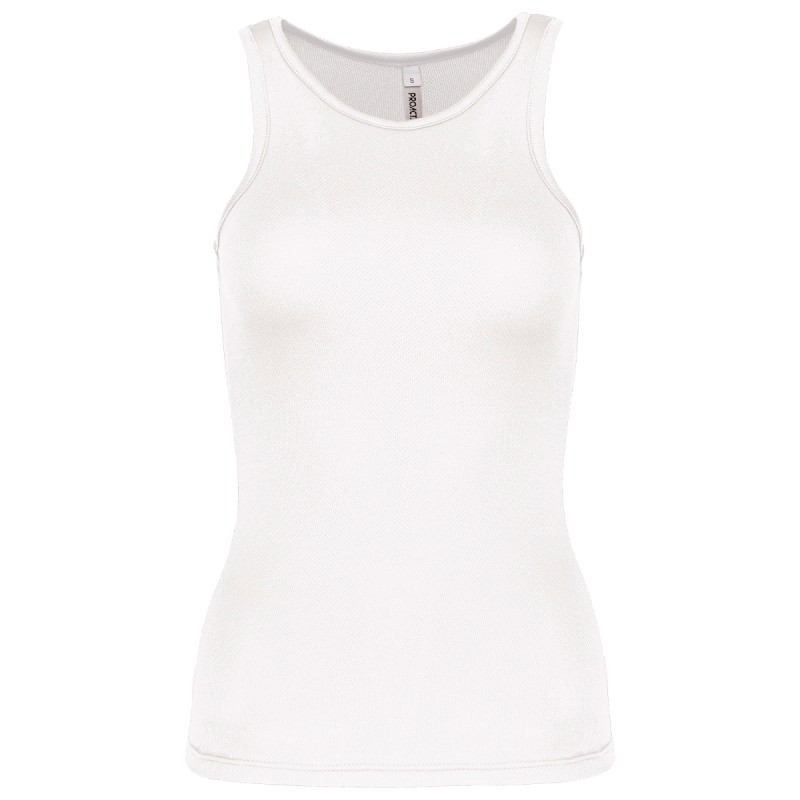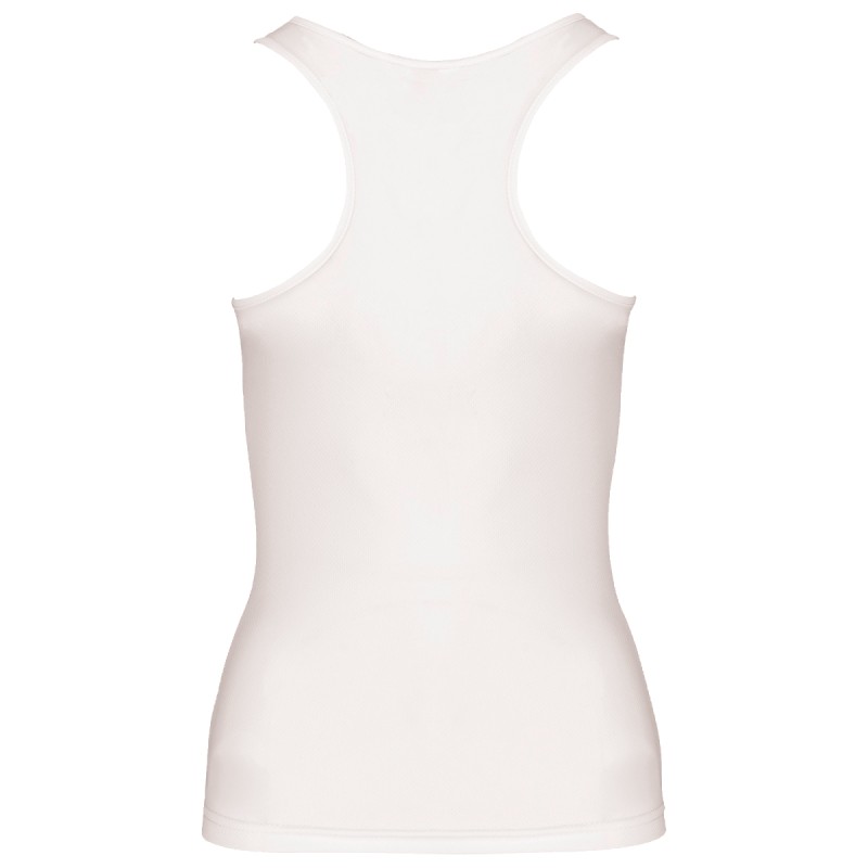 100% polyester. Tissu léger à séchage rapide. Dos nageur. Biais à l'encolure et aux emmanchures. Finition double aiguille au bas du vêtement. Certifié STANDARD 100 by OEKO-TEX® N° CQ 1007/7, IFTH.