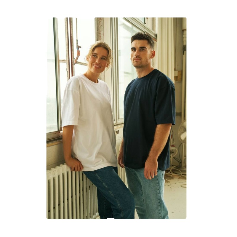 Double couture à la taille et aux manches. Manches droites. Coupe ample.