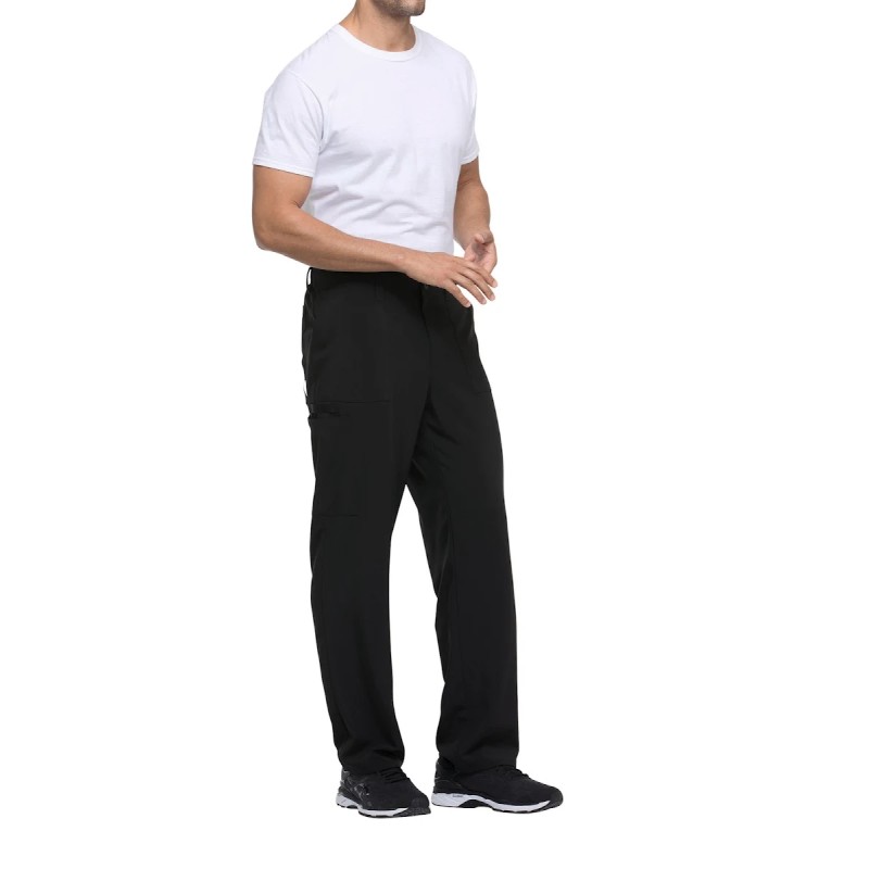 95% polyester / 5% élasthanne. Coupe masculine. Ceinture élastique au dos avec cordon intérieur. Braguette zippée avec fermeture à bouton. Cinq passants de ceinture. Six poches : deux poches frontales plaquées, deux poches cargo, deux poches arrière. Bande en sergé utilitaire boucle d'instrument.