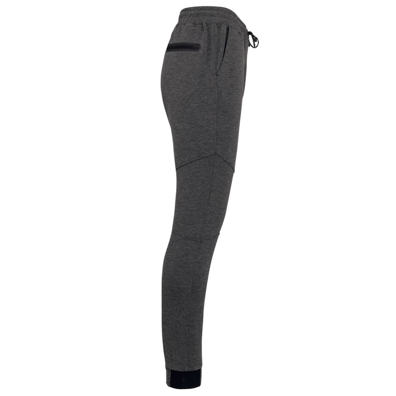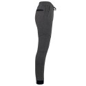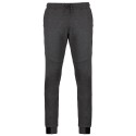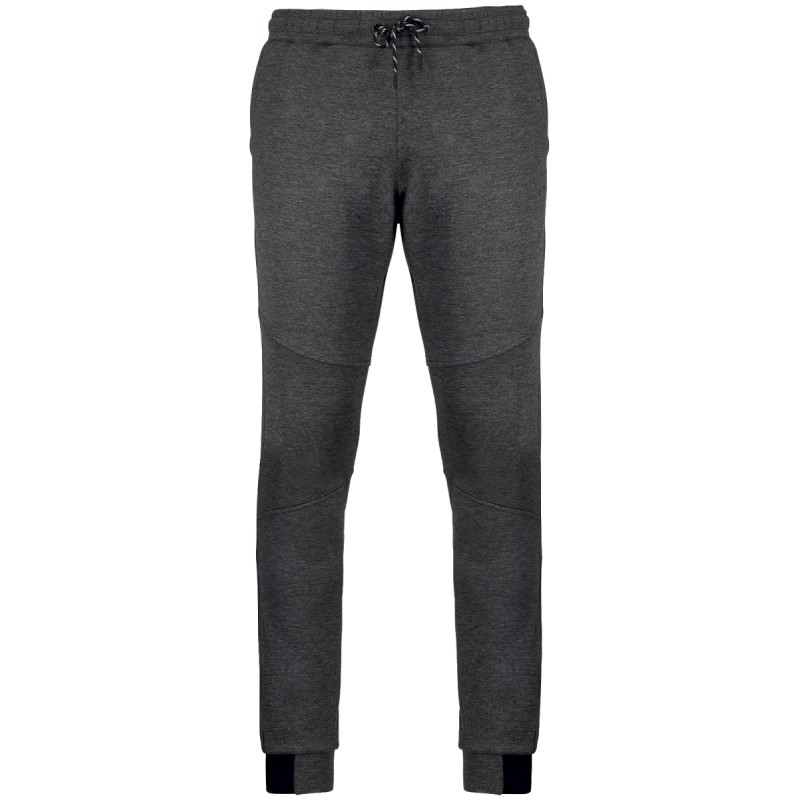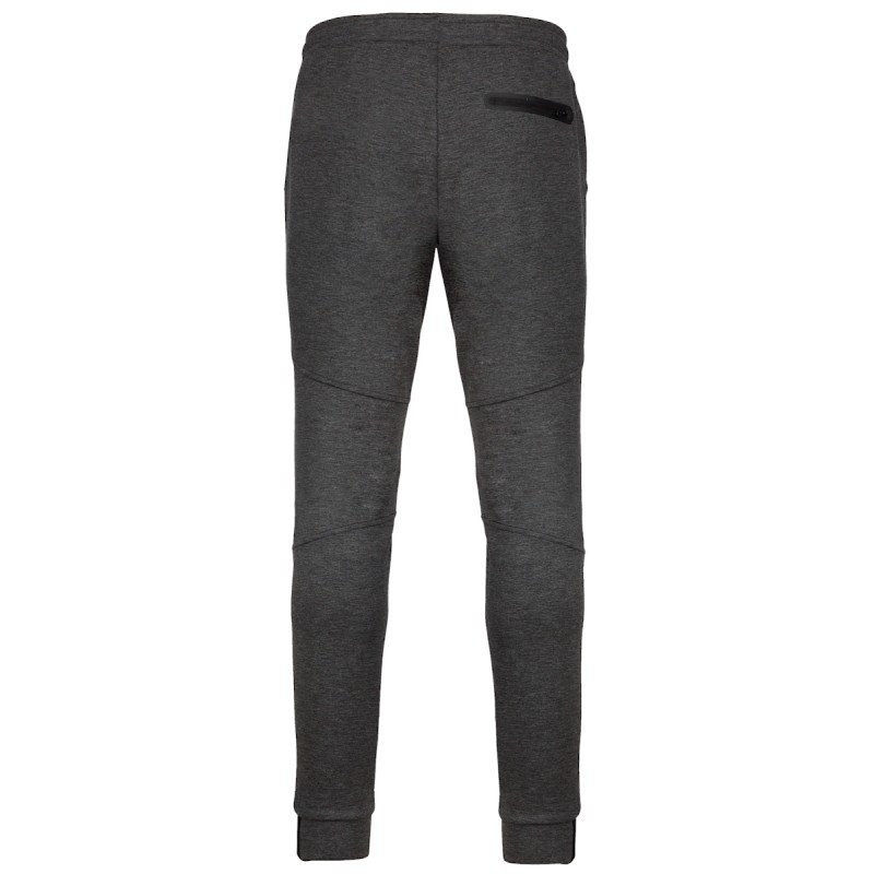94% polyester/ 6% élasthanne (79% polyester/ 15% viscose/ 6% élasthanne pour coloris chiné). Matière ultra confortable. Ceinture élastiquée avec cordon de serrage bicolore finition embout plastique. 2 poches devant doublure jersey 65% polyester/ 35% viscose et 1 poche arrière zippée finition thermosoudée. Coupe moderne et ajustée avec empiècements genoux. Bas de jambes resserré avec une partie élastiquée contrastée Black sur tous les coloris et Dark Grey sur le Ash Heather.