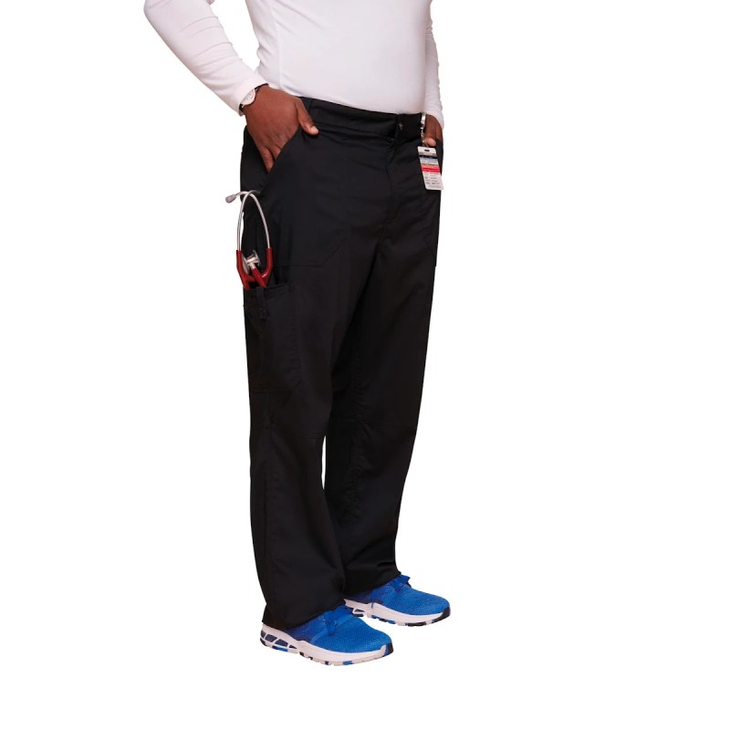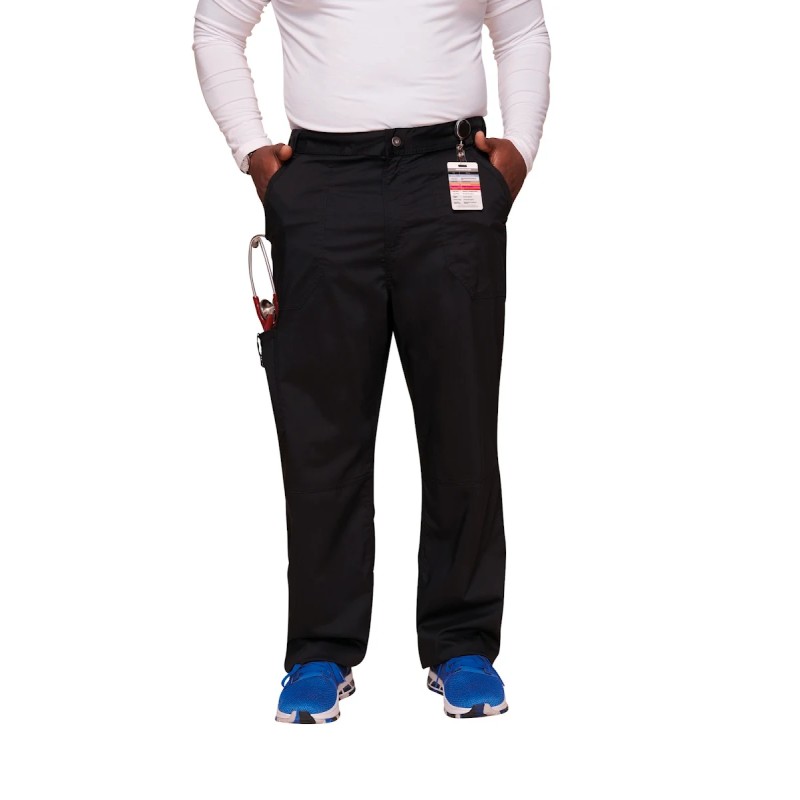 78% polyester / 20% viscose / 2% élasthanne. Tissu sergé. Coupe masculine. Ceinture élastique au dos avec cordon de serrage intérieur. Braguette zippée avec fermeture à bouton. Cinq passants de ceinture. Sept poches : poche cargo double, poches plaquées, poches arrières, poche accessoire. Etiquette du logo avec boucle élastique. Jambe fuselée, ouverture 48 cm.