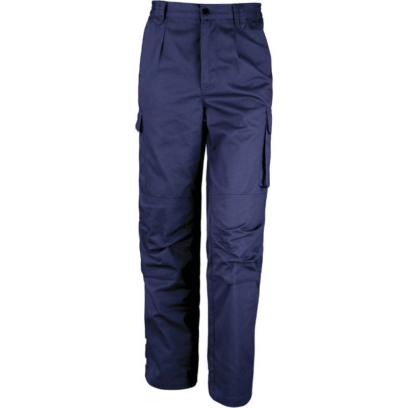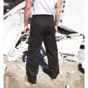 65% polyester / 35% coton. Pantalon coupe-vent. Taille extensible, avec fermeture par bouton et braguette zippée. Coutures articulées aux genoux. Coutures double piqûre renforcées sur les zones sollicitées. Multi poches : larges poches latérales avec finitions réfléchissantes, poche cargo avec fermeture Velcro®, poche pour téléphone portable, poches arrières avec fermeture Velcro®, poche pour mètre, 2 poches latérales profondes, passant porte marteau.