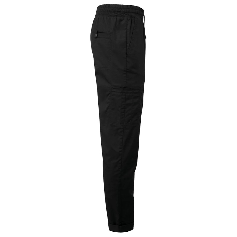65% polyester recyclé / 35% coton. Taille élastique et cordon de serrage. Braguette à fausse couture. Bas de jambe fuselé avec ourlets retroussés.