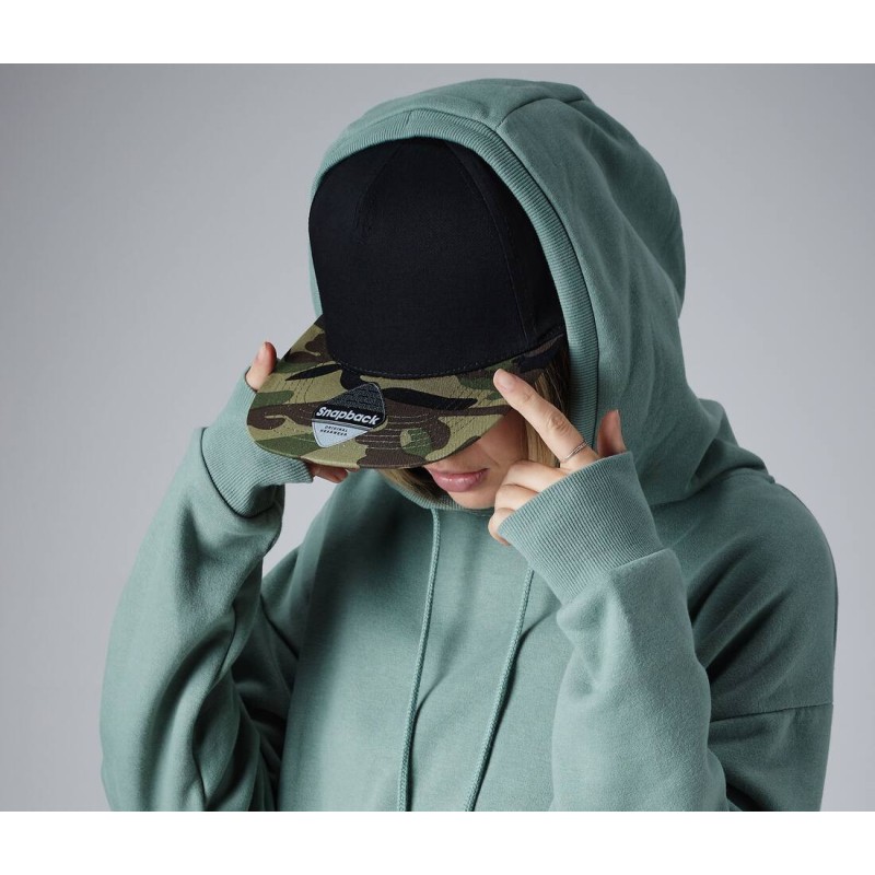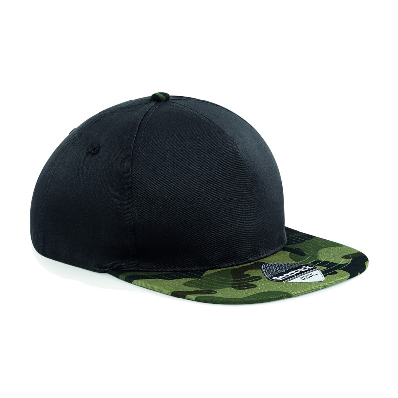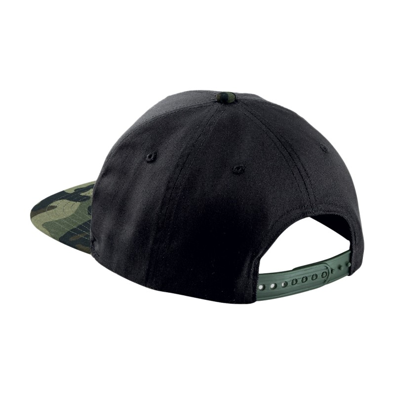 100 % coton twill | 5 panneaux design | Trous d'aération brodés | Visière plat | Fermeture en matière plastique à taille ajustable | Détails de camouflage | Etiquette TearAway pour une simple personnalisation