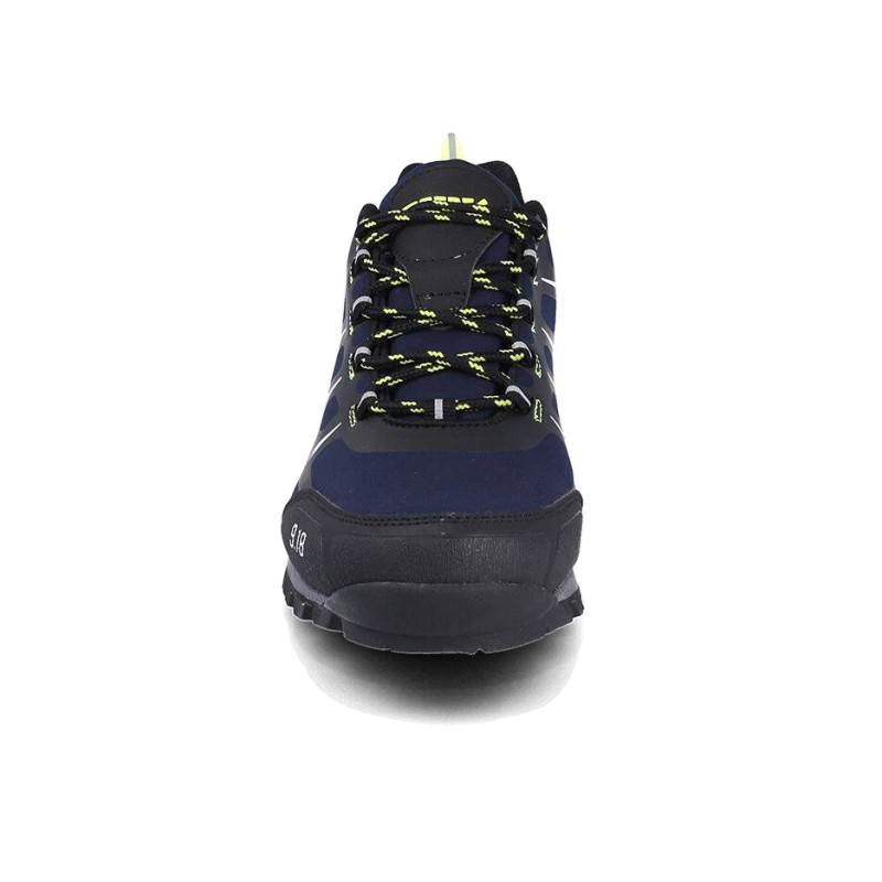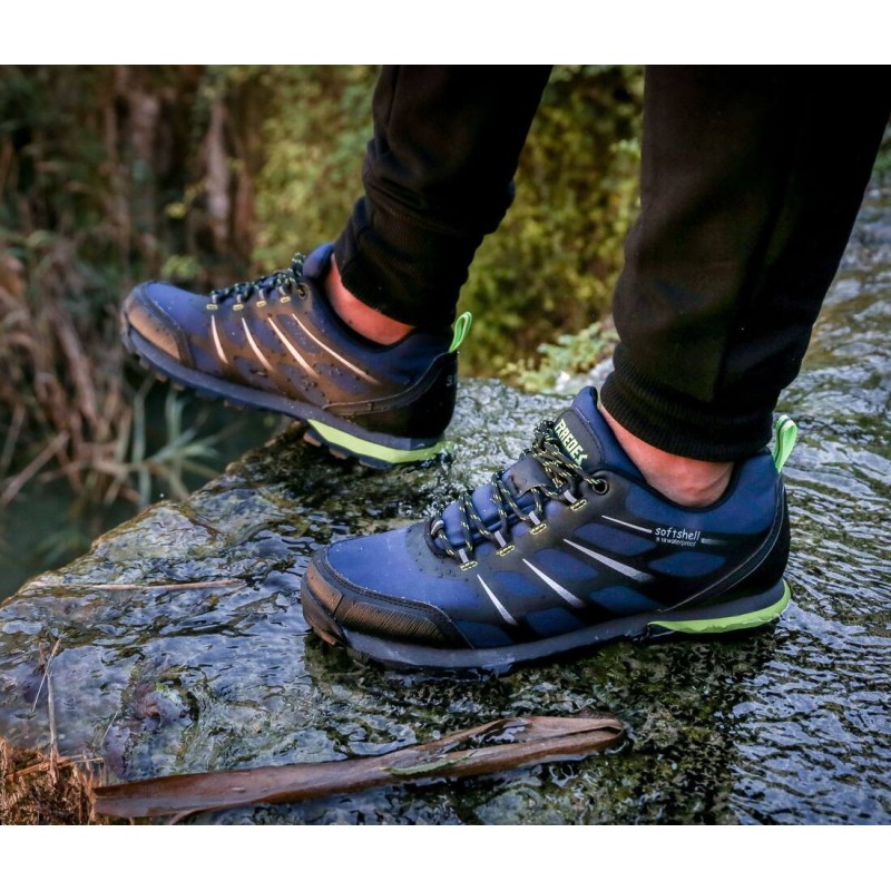 Semelle en polyuréthane double densité et caoutchouc. Tige en Softshell avec renforts aux orteils et au talon. Doublure imperméable.
