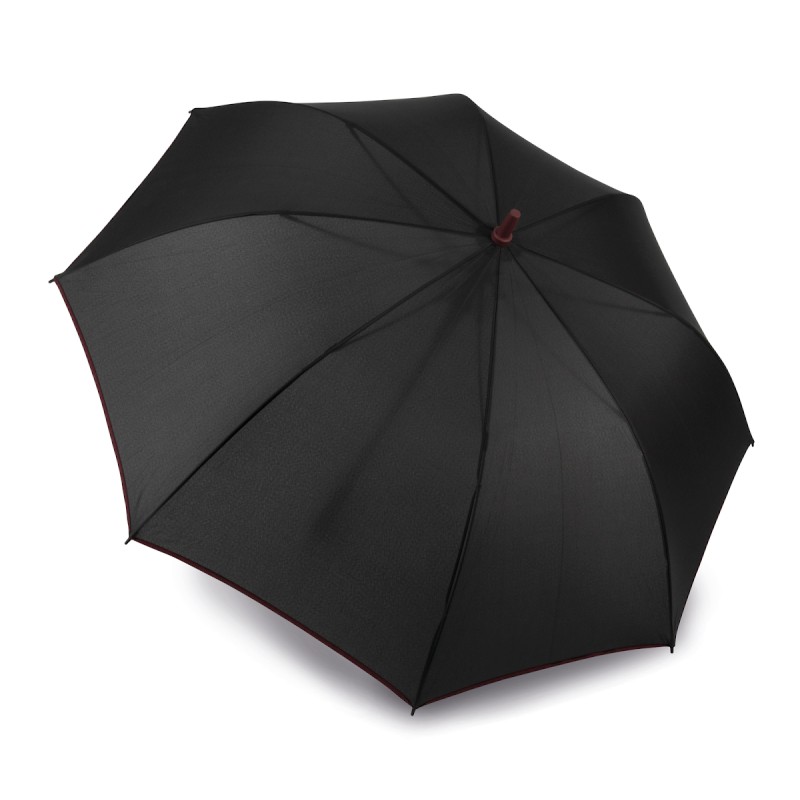 100 % polyester. Grand parapluie, type golf, (diamètre : 118 cm), à ouverture automatique. Il se compose d'un mat en métal de 14 mm, de baleines en fibres de verre, de pointes et embouts de baleine en polycarbonate colorés. La toile est en pongé de polyester. Bord des panneaux, poignée et tige en couleur contrastée.