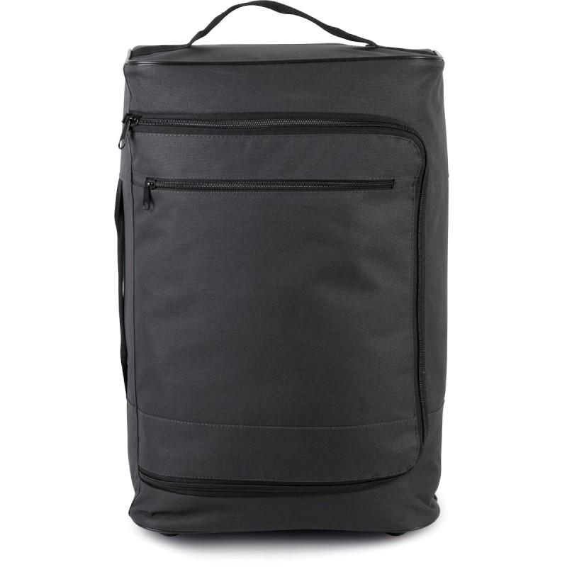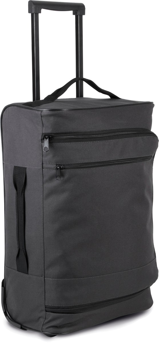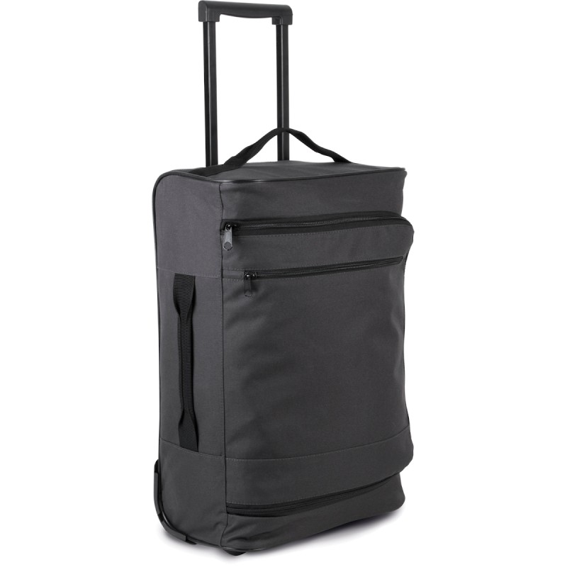 Sac trolley cabine en polyester 600D. Base semi-rigide avec renforcement en relief et pieds de stabilité en plastique. Compartiment unique avec large ouverture zippée par le haut. Poche zippée pour faciliter la personnalisation. Poignée sur le côté.