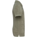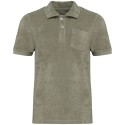 80% coton biologique / 20% polyester recyclé post-consumer. Fabriqué au Portugal. Coton peigné. Matière éponge. Coupe ajustée. Coutures latérales. Lavé aux enzymes. Poche plaquée poitrine. Demi-lune au dos. Col en matière principale. Manches courtes avec finition bas de manches en bord côte 1x1 et surpiqûre aux emmanchures. Patte de boutonnage avec 2  boutons en plastique blanc effet nacré. Renfort épaule en matière principale. Ourlet double aiguille bas de vêtement. Fentes latérales et encolure avec bande de propreté intérieure en chevrons ton sur ton.