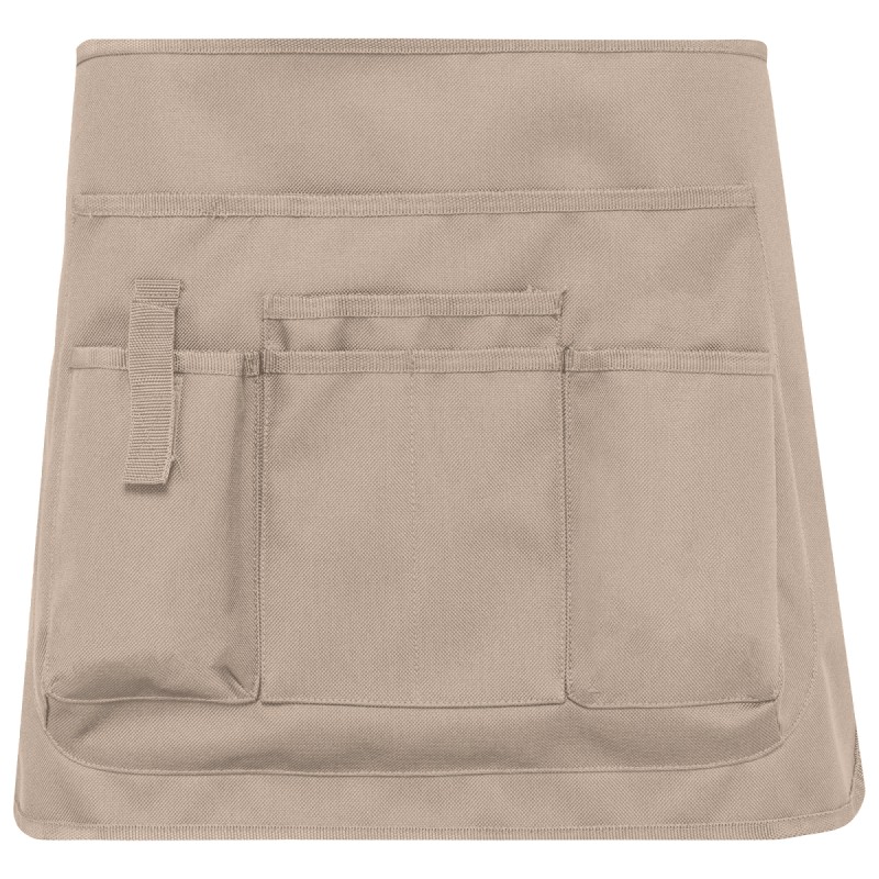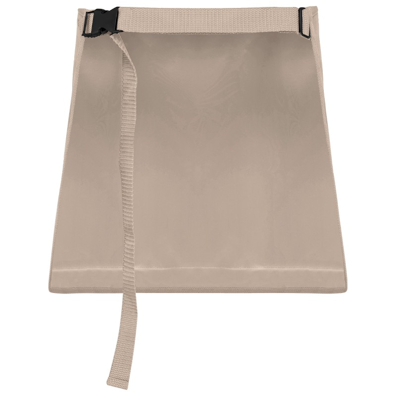 100% polyester recyclé. Tissu Oxford enduit et imperméable 4000 mm. 2 niveaux de poches : 1 grande poche centrale milieu + 4 poches dont 1 avec double compartiments  et 1 avec patte et bande auto-agrippante. Biais de finition ton sur ton. Lanière et boucle de réglage en plastique recyclé pour ajuster la taille du tablier. Hauteur totale tablier  35 cm. Largeur bas du tablier  54 cm. Étiquette détachable.