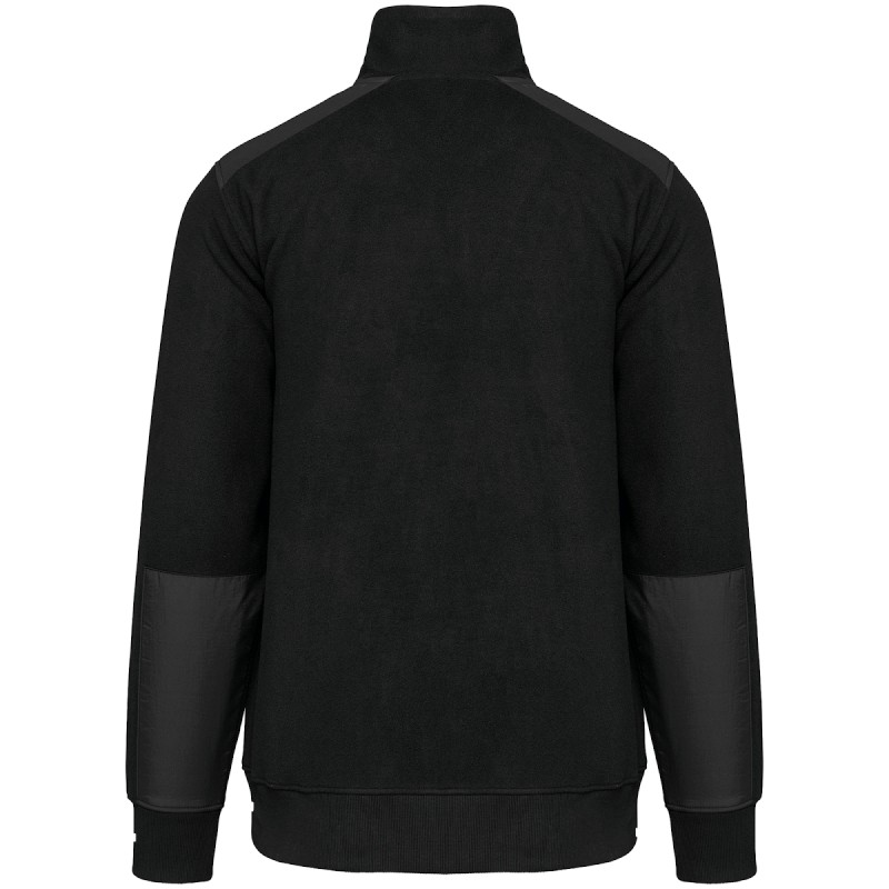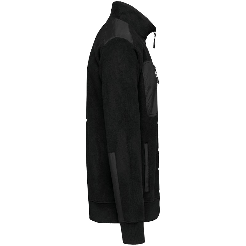 100% polyester recyclé. Coupe droite. 2 poches zippées passepoilées en taslan devant avec tire-zip. 1 poche poitrine arrondie zippée avec tire-zip côté droit au porté en taslan avec surpiqûres ton sur ton. Col doublé avec côte 2 x 2 et zip en plastique recyclé + lien d'accrochage intérieur col. Empiècements de renfort épaules et avant bras en taslan. Bord-côtes tubulaire en rib 2 x 2 aux bas de manches et de vêtement. Etiquette de marque détachable.