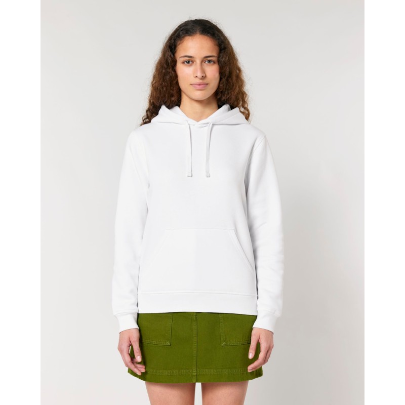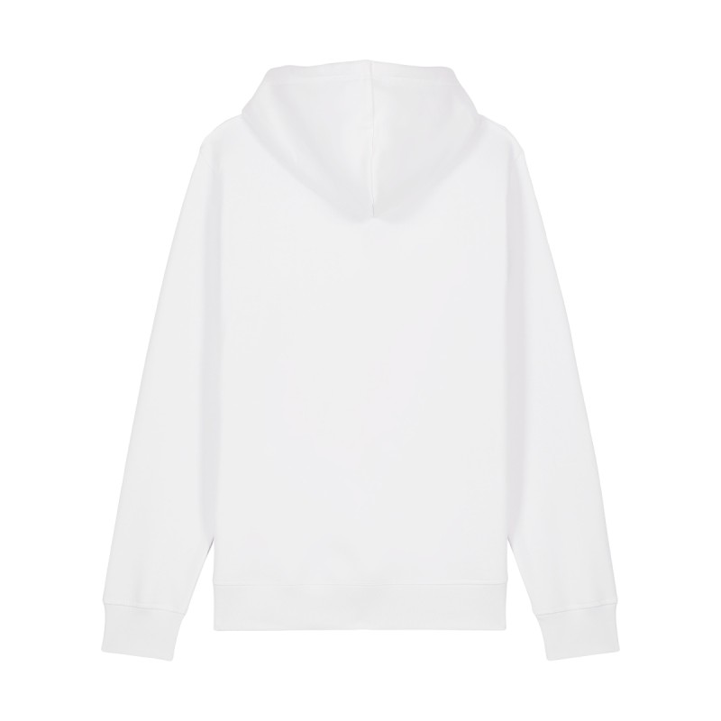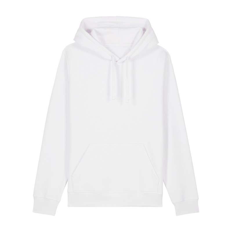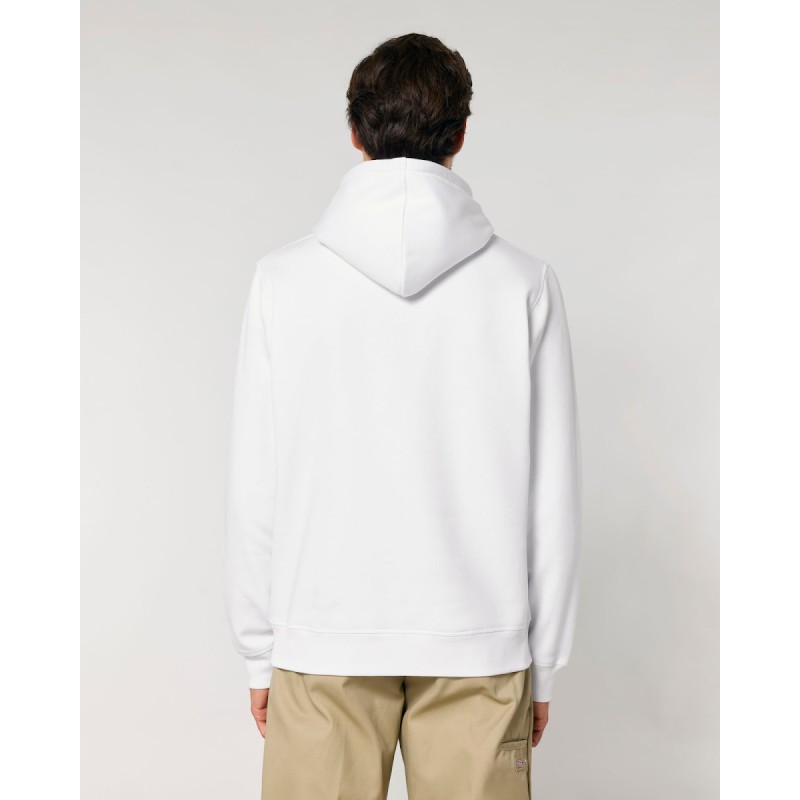 Manches montéesCapuche doublée dans la même matièreCordons de serrage plats ton sur tonŒillets de boutonnière surpiquésBande d’encolure dos à chevronsDemi-lune dans la même matière au niveau de l’encolureBords poignets et bas en côtes 1x1Coutures toutes surpiquées flatlockPoche kangourou à surpiqûres flatlock