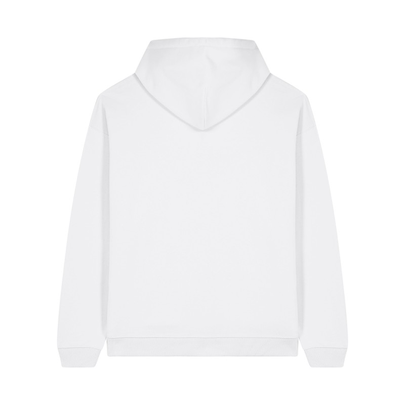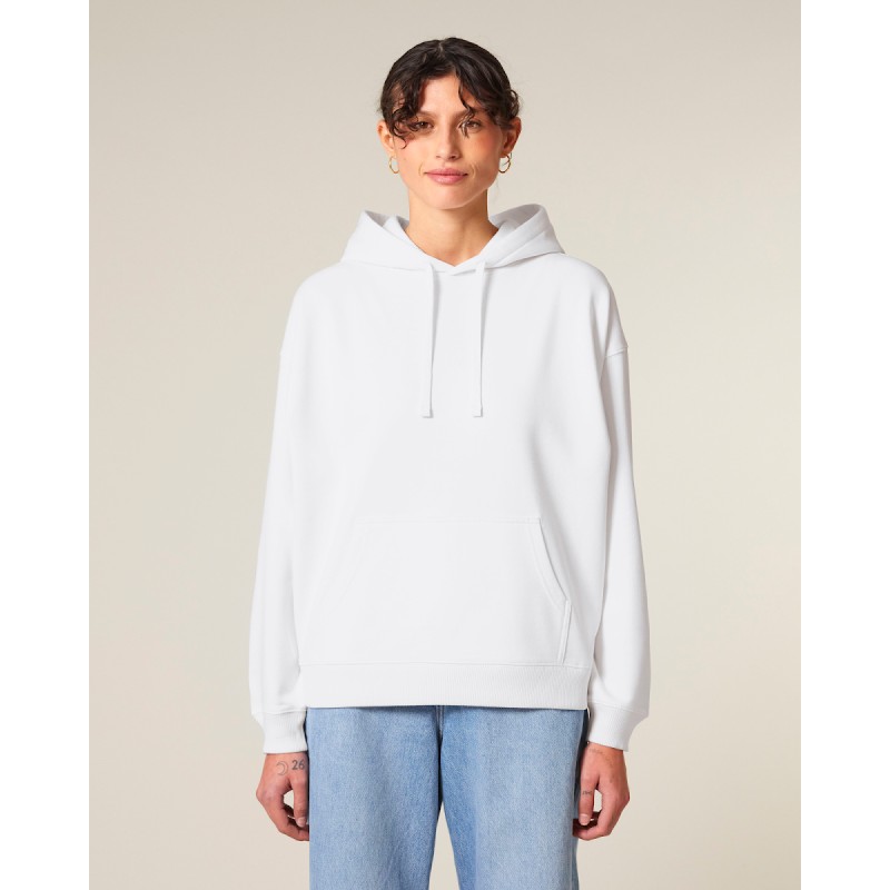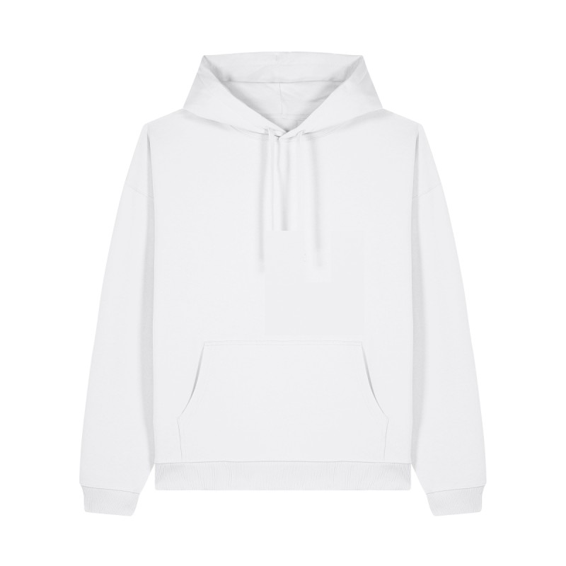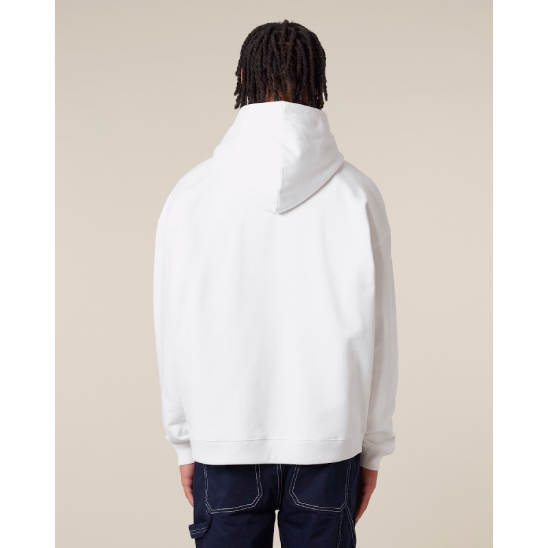 Manche montéeCapuche double épaisseur en tissu de la même matièreCordon plat de la couleur du corpsŒillets brodésSurpiqûre double sur toutes les couturesCôtes 2x1 aux poignets des manches et à l'ourlet du basPoche kangourou à l'avantBande de renfort en chevron à l'intérieur du colDemi-lune en tissu de la même matière au dos du cou