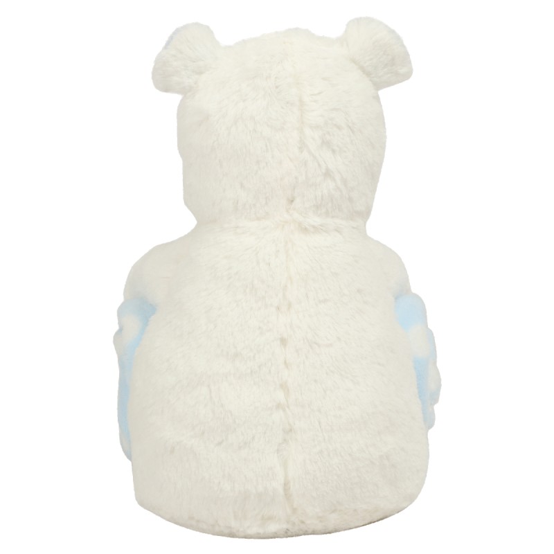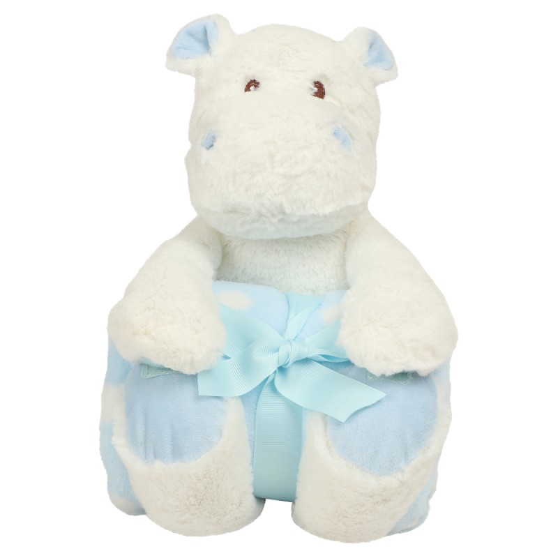 L'hippopotame est recouvert d'une fourrure blanche toute douce avec de petites touches de bleu ou de rose pour convenir aux tout-petits ou à un nouveau-né. Un doudou couverture moelleux, orné de jolis pois, enroulé et tenu sous les bras de l'hippopotame est parfait pour y broder ou imprimer des noms.