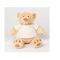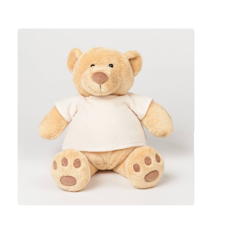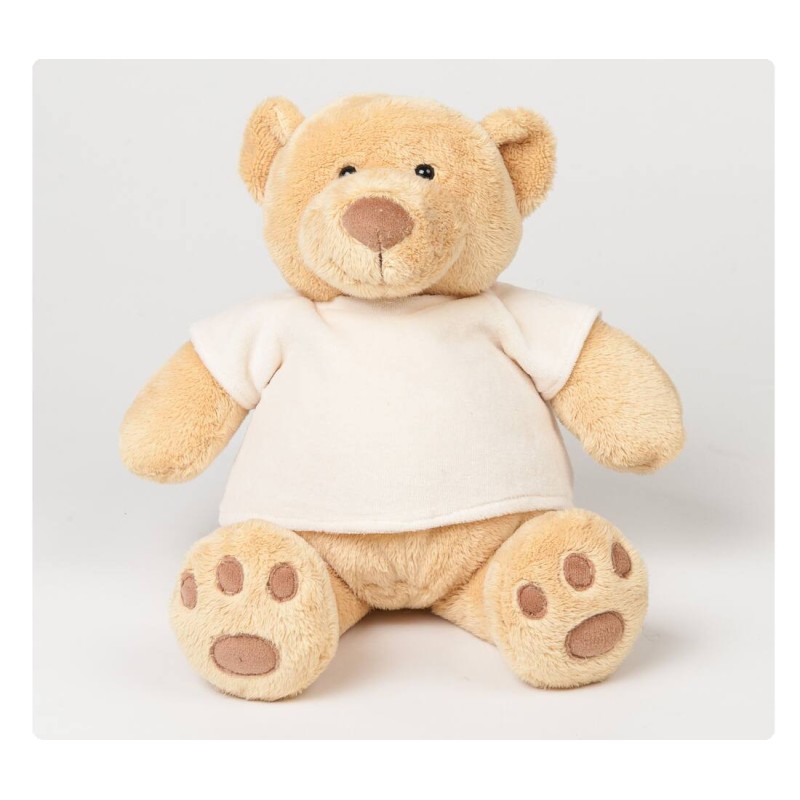 L’ours en peluche tout doux Honey, de couleur miel, est habillé d’un t-shirt crème.