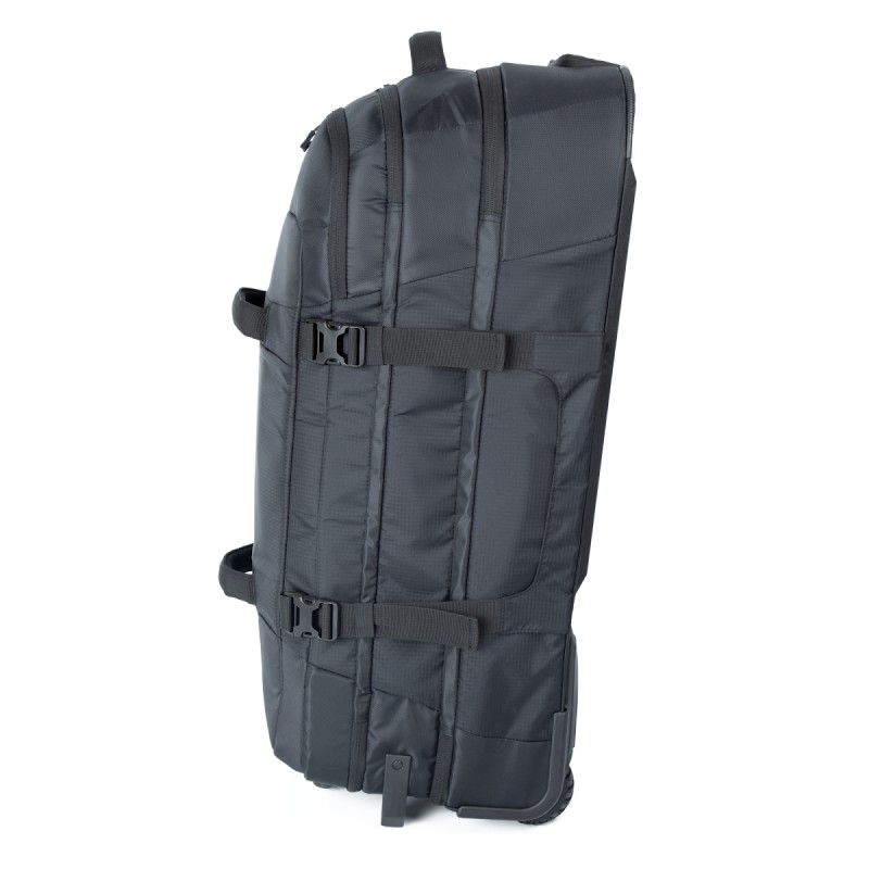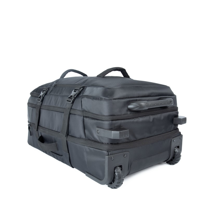 100% polyester. Trolley de taille XL. Double compartiment avec panneau de séparation zippé pour le transformer en un seul grand compartiment. Grande poche frontale avec double poignée. Système de trolley rétractable. Sangles de compression latérales avec grandes boucles. Poignée au niveau des roues qui permet au trolley d'être stable même lorsqu'il est chargé.