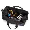 100% polyester. Sac à outils en polyester avec fond plastique. Grande ouverture unique en haut pour faciliter la recherche des outils. Sangles latérales pour assurer la solidité de la structure même avec un poids relatif et pour accueillir le niveau à bulle. Bandoulière réglable.