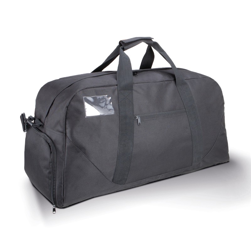 100% polyester. Sac en polyester 600D. Lanière d'épaule ajustable et amovible, poche côté zippée, porte-étiquette sur le côté pour identification, anses renforcées, poche range-chaussures sur le côté, pieds de stabilité.