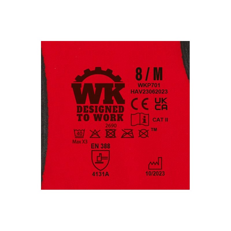 Support tricoté en polyamide et élasthanne. Jauge 15. Enduction en micro mousse de nitrile sur la paume et les doigts. Poignet élastiqué avec finition en surjet élastique de couleur variant en fonction de la taille du gant. Lavable à 40°C programme délicat. EPI Classe II. Normes NF EN ISO 21420:2020 (Gants de protection - Exigences générales et méthodes d’essai), NF EN 388+A1:2018 (Gants de protection contre les risques mécaniques) : Niveaux de performance 4131A. Poids d’une paire de gants en taille 10 : 44g.